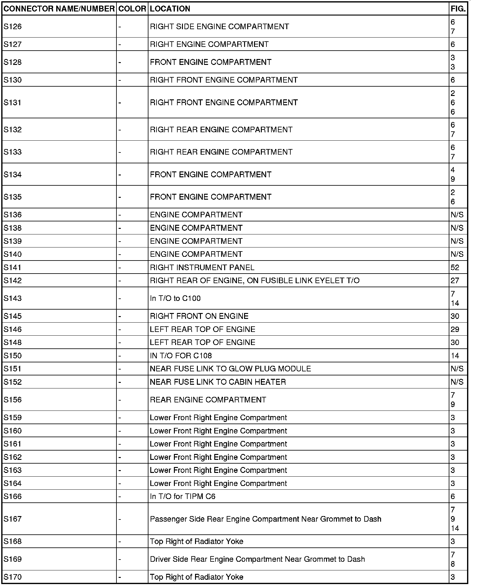 This section provides illustrations identifying connector, ground and splice locations in the vehicle. Connector, ground and splice indexes are provided. Use the wiring diagrams in each section for connector, ground and splice identification. Refer to the appropriate index for the proper figure number. For items that are not shown in this section N/S is placed in the Fig. column.