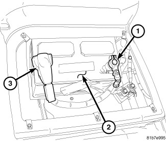 1. Open trunk lid. Remove battery cover. Disconnect negative battery cable (1).