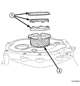 36. Install reverse shift fork (1) synchronizer hub with detents (2) and sleeve.