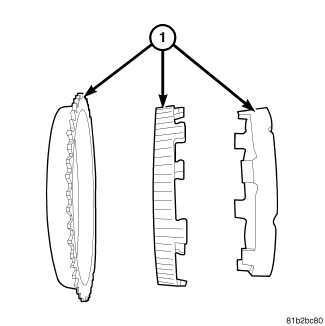 Synchronizer components: Inspect synchronizer rings (1) for worn, chips, or cracked teeth and burned or flaking friction material. Place blocker rings on gears. While applying pressure and rotating the blocker ring measure the clearance between the blocker ring and gear. If clearance is greater than 0.75 mm (0.030 in.) replace blocker ring. Synchronizer rings (1) are serviced as an assembly.