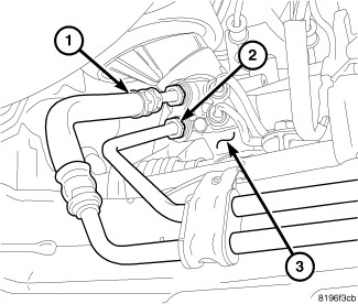 5. Install the return tube (1) at the gear (3). Tighten the tube nut to 20 Nm (15 ft. lbs.).