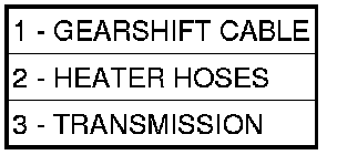 6. From under the hood, route the gearshift cable (1) forward of the air conditioning lines and the heater hoses (2) and toward the transmission (3) manual lever.