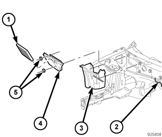 3. Position the insulator (4) into its installed location and install the push-pin retainer (5) that secures the insulator to the front of the fresh air inlet housing (2).