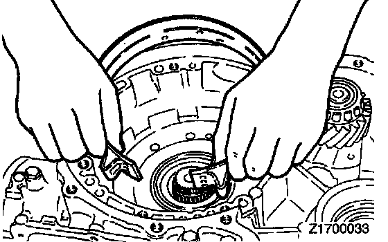 16. Install the tapered roller bearing outer race, and then the snap ring.