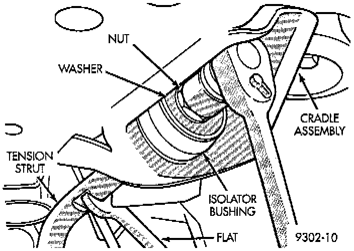 3. Install washer on end of tension strut. Install a NEW tension strut to cradle bracket nut, on tension strut. Tighten the tension strut to cradle bracket retaining nut to a torque of 150 Nm (110 ft. lbs.). When torquing tension strut nut, keep tension strut from turning by holding tension strut at flat using a large open end wrench.