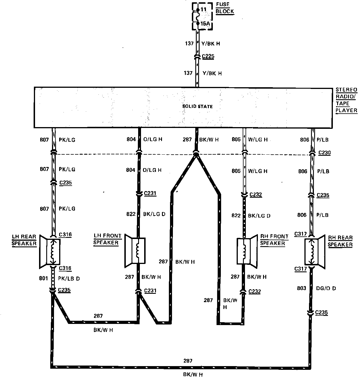Fig. 84 Radio & speaker wiring circuit. 1983-84 Escort, EXP, Lynx & 1983 LN7 with stereo radio less premium sound: