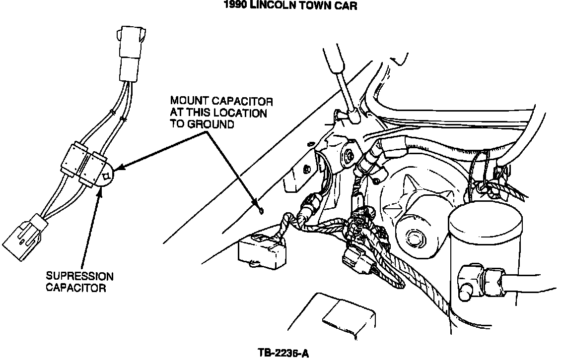 2. Connect a suppression capacitor (F0DZ-18841-A) in series with the heated windshield power feed line.