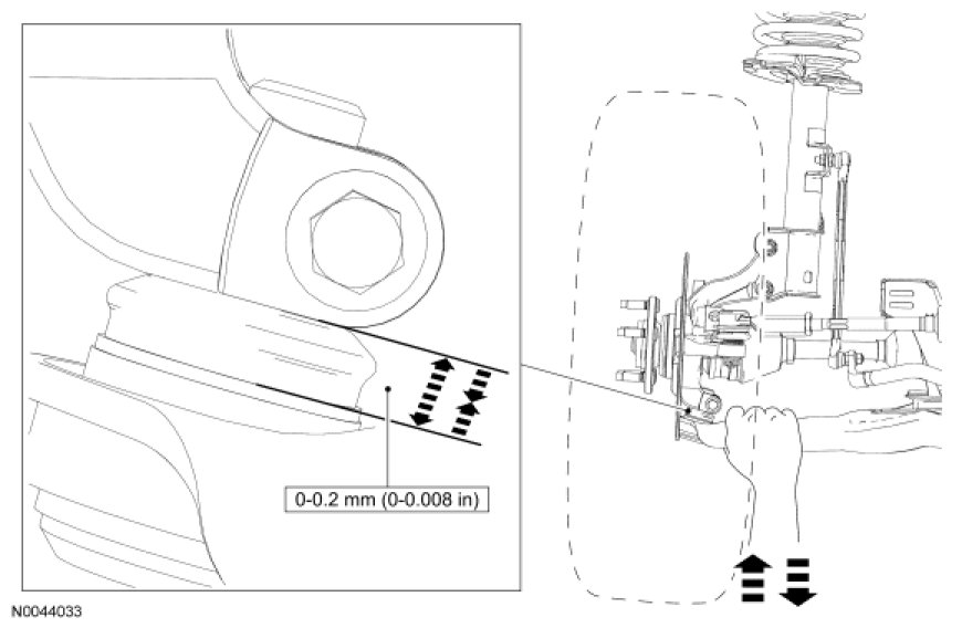 4. NOTICE: Do not use any tools or equipment to move the wheel and tire assembly or suspension components while checking for relative movement. Suspension damage may occur. The use of tools or equipment will also create relative movement that may not exist when using hand force. Relative movement must be measured using hand force only.