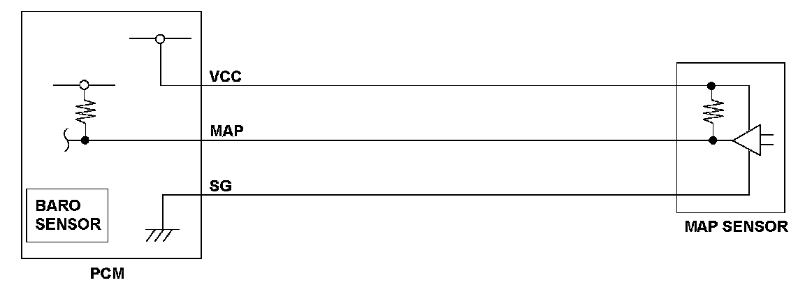 The barometric pressure (BARO) sensor is built into the powertrain control module (PCM), and it monitors atmospheric pressure. The PCM estimates appropriate intake airflow from the manifold absolute pressure (MAP) sensor output voltage and the BARO sensor output voltage. If the BARO sensor output voltage is a specified value, the PCM detects a malfunction and stores a DTC.