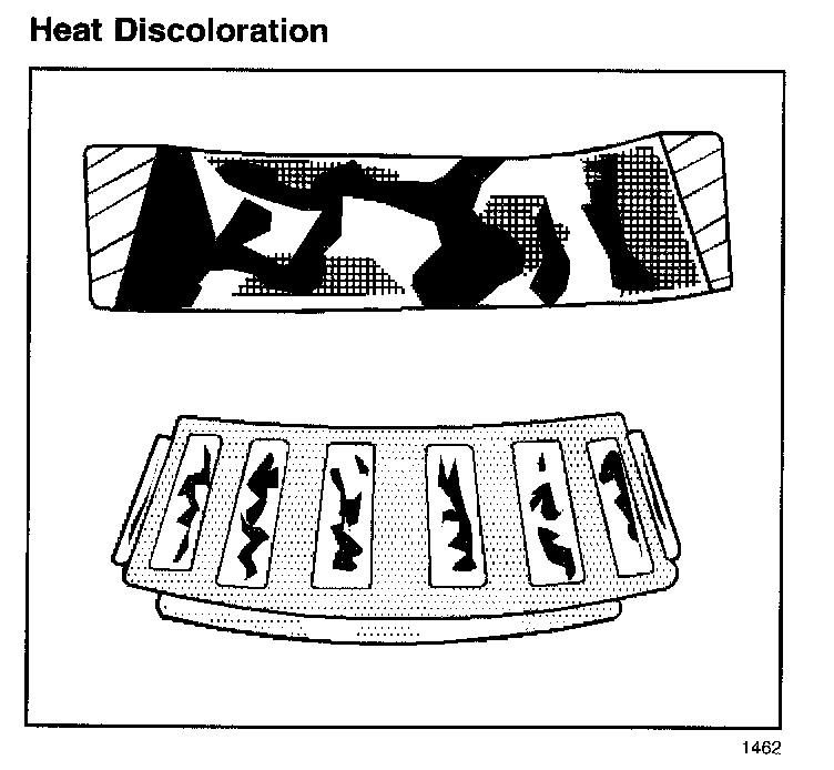 Heat discoloration ranges from faint yellow to dark blue. This discoloration results from overload or an incorrect lubricant. Excessive heat causes softening of the races or the rollers. In order to check for loss of temper on the races and the rollers, perform a file test. A file drawn over a tempered part will grab and cut the metal. A file drawn over a hard part will glide readily with no metal cutting. Replace the bearings if overheating damage is indicated. The tempered part will fail the file test. Check the seals and the other related parts.