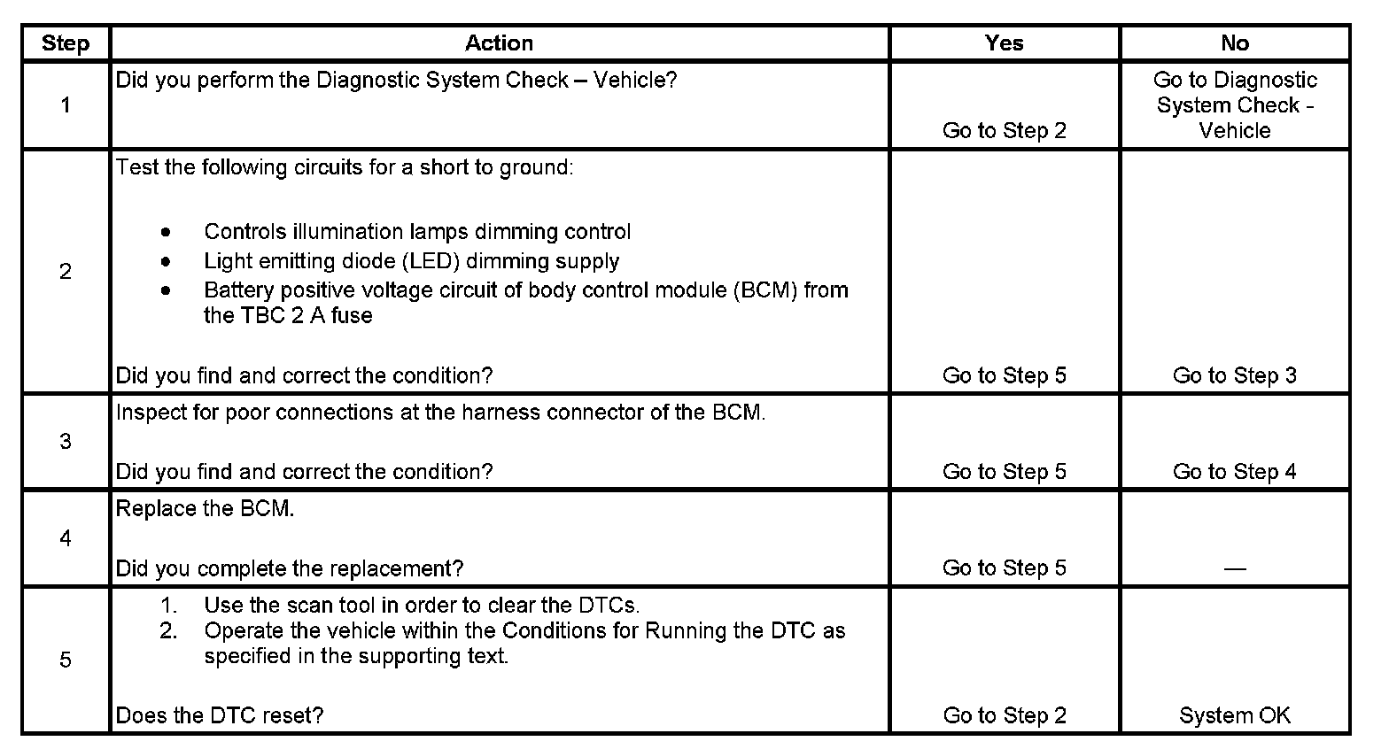 The body control module (BCM) receives a variable voltage signal from the instrument panel (I/P) dimmer switch requesting to illuminate the dimming lamps to a desired intensity. When this occurs, the BCM directly sends a pulse width modulated (PWM) voltage based on the I/P dimmer switch position on the light emitting diode (LED) dimming supply circuit, controls illumination lamps dimming control circuit, and the instrument panel lamps dimming supply voltage circuit.