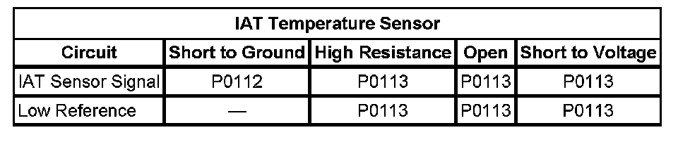 3. An IAT sensor that is skewed lower at various ambient temperatures, due to more resistance than is normal, can widen the spread between the two sensors and cause this DTC to set. Measure and record the resistance of the IAT and IAT 2 sensors at various ambient temperatures, and then compare those measurements to the Temperature vs. Resistance Table.