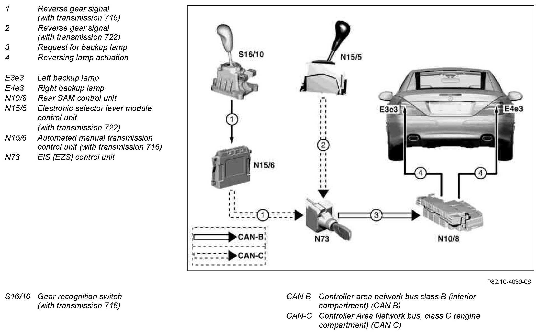 By engaging the reverse gear, the gear recognition switch (S16/10) transmits the signal "reverse gear" directly to the automated manual transmission control unit (N15/6). The automated manual transmission control unit (N15/6) passes on the signal "reverse gear" over CAN-C (CAN-C) to the EIS control unit (N73). This forwards the signal over CAN-B (CAN-B) to the rear SAM control unit (N10/8).