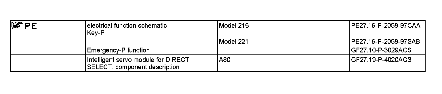 The park pawl only permits shifting out of selector lever position "P" through the gear selector switch DIRECT SELECT (S16/13) when the transmitter key (A8/1) is turned into position "circuit 15 ON" and the brake pedal is operated.