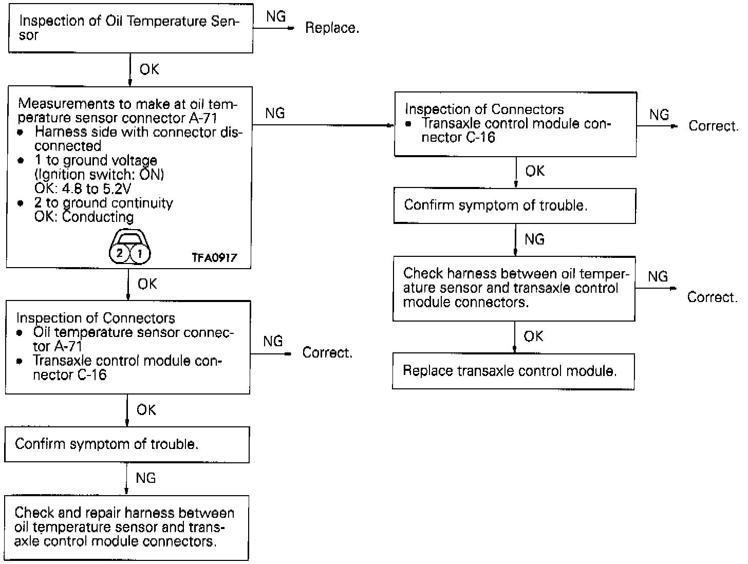 When the oil temperature sensor output is over 4.4V even after 10 minutes of operation, code No. 15 is output to indicate that there is an open circuit in the oil temperature sensor (meaning the oil temperature does not rise).