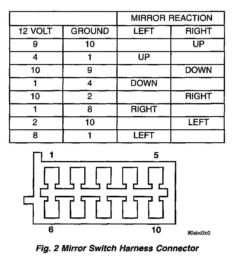 3. Using two jumper wires, one connected to a 12 volt battery source, and the other connected to a good body ground. Refer to the Mirror Motor Test table for appropriate mirror response, using the mirror switch wiring harness connector.